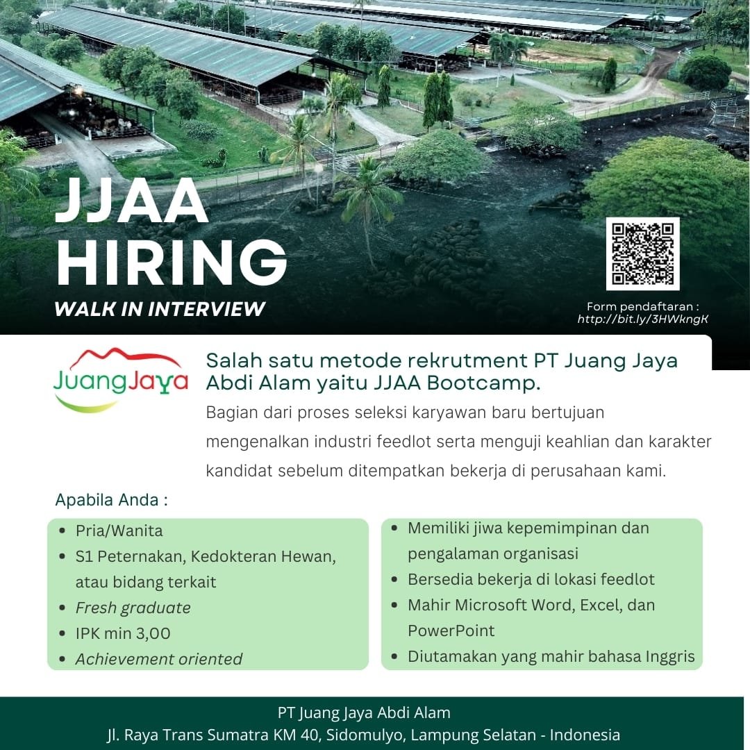 PT Juang Jaya Abdi Alam (JJAA) membuka kesempatan karir pada industri peternakan sapi potong. Proses rekrutmen akan digelar langsung di berbagai kampus.