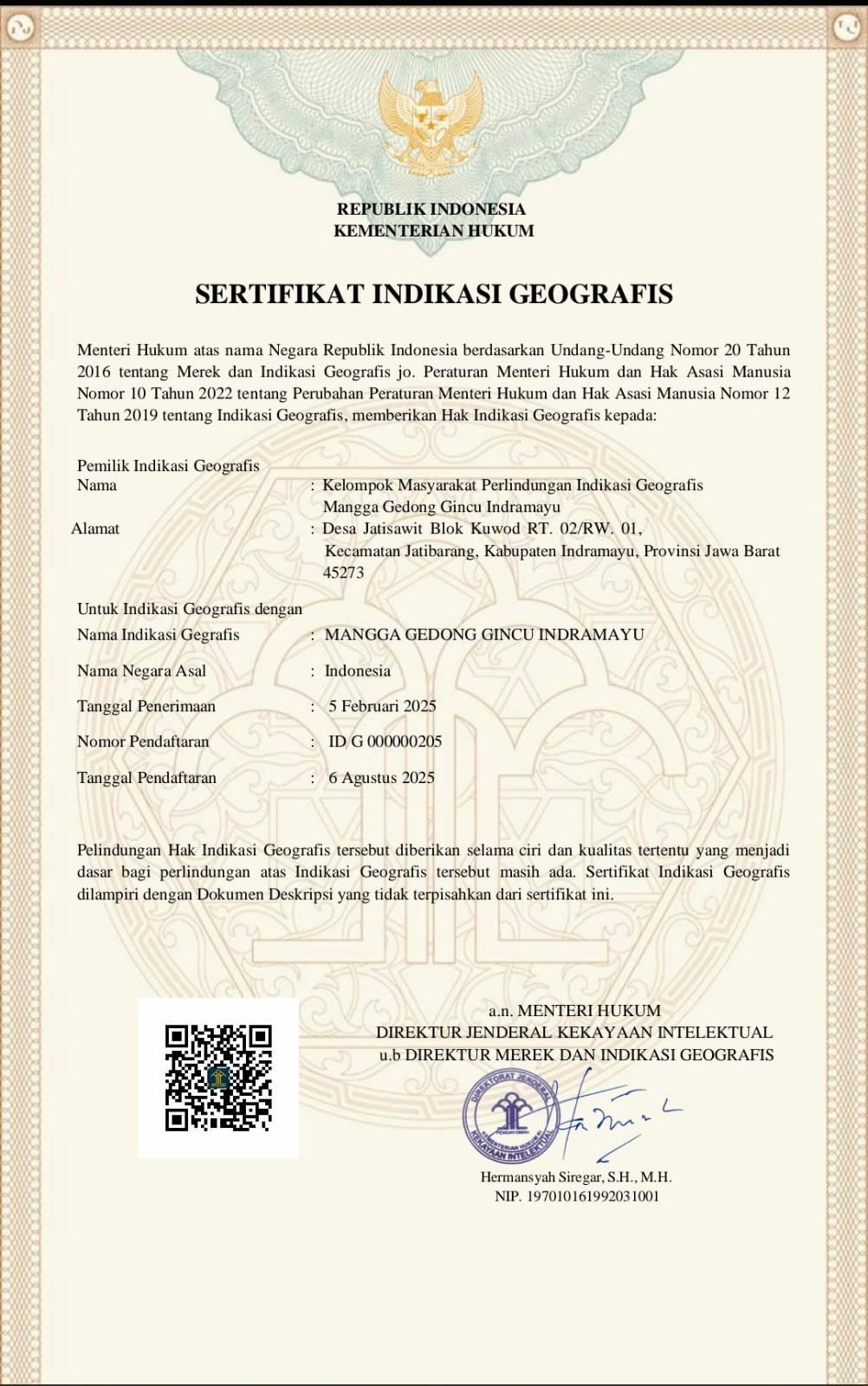 MANGGA GEDONG GINCU Indramayu, Dikukuhkan dengan Sertifikat Indikasi Geografis